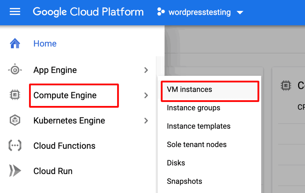 Đăng nhập vào host(VPS) chứa website WordPress của bạn trên Google Cloud bằng SSH. Vào trang chủ Google Cloud Platform https://console.cloud.google.com, click vào menu ở góc trái bên trên.